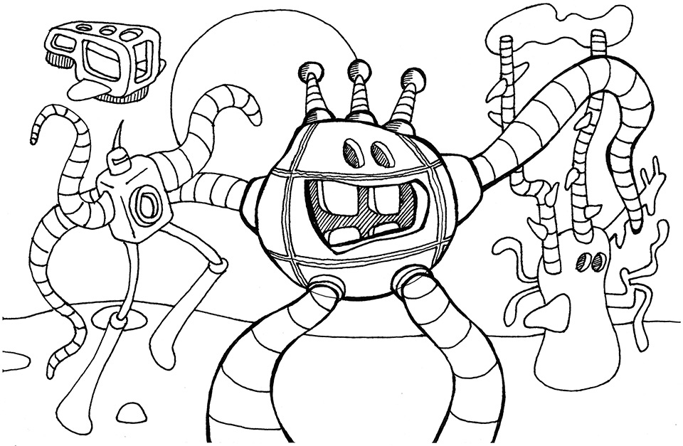ink on paper sketch about robots with buck teeth hugging.