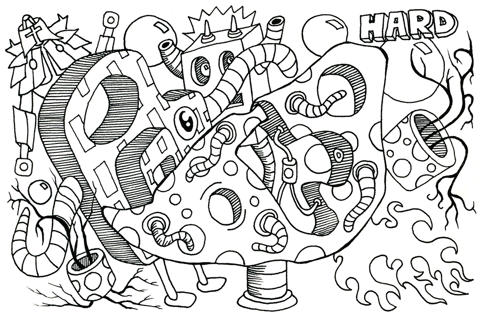 ink on paper illustration with flames, robots, dead trees and tentacles.