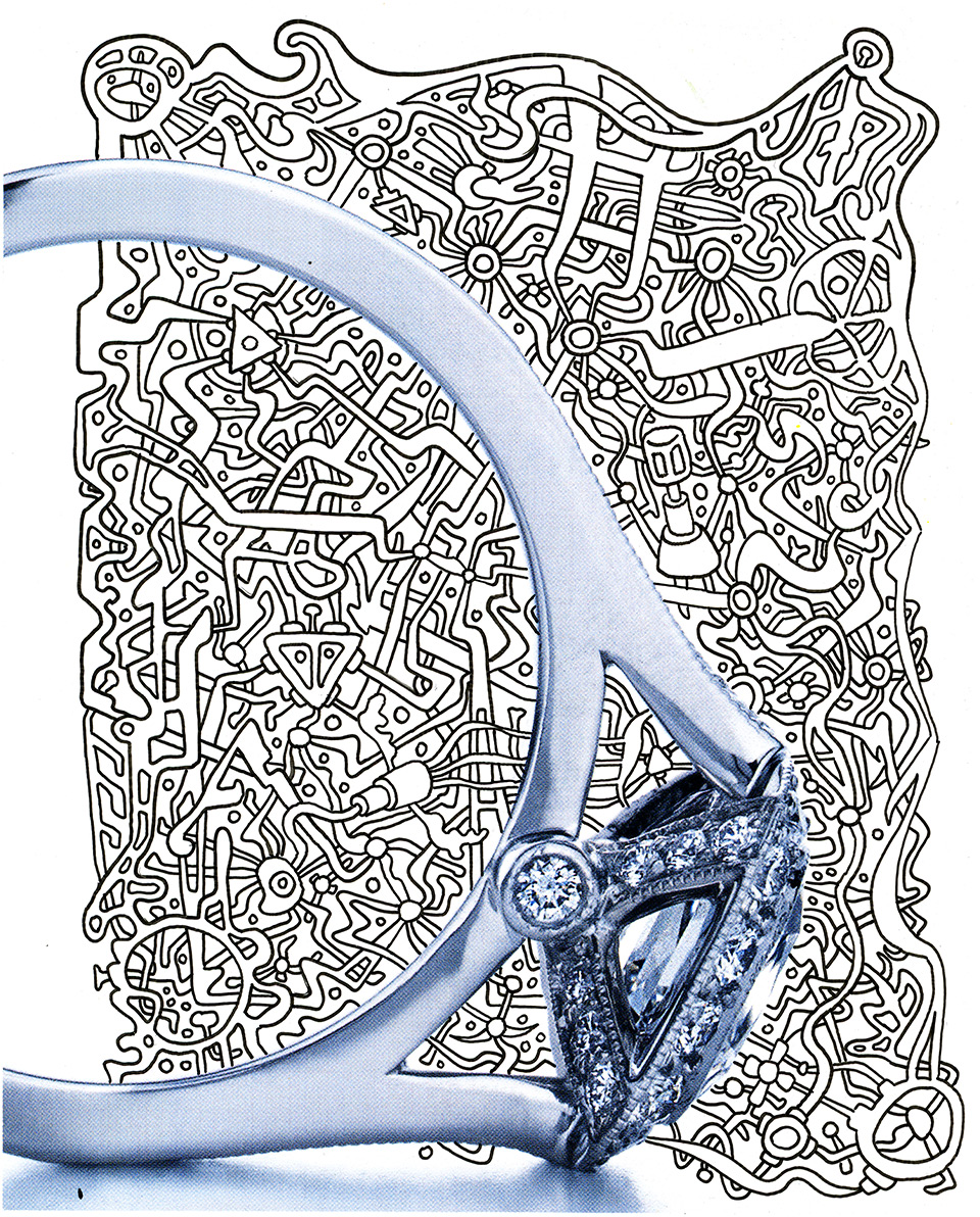 Ink on a magazine ad. This illustration has lots of psychedelic art nouveau doodling around a diamond ring.