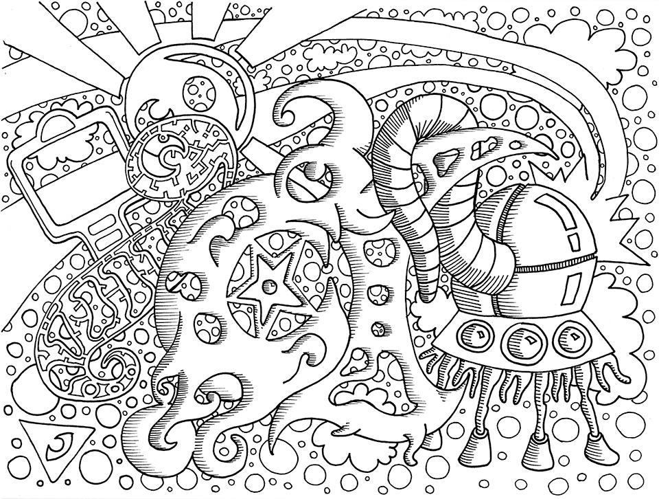 a gnarly illustration with a starphoid mothership, stars, and tentacled robot.