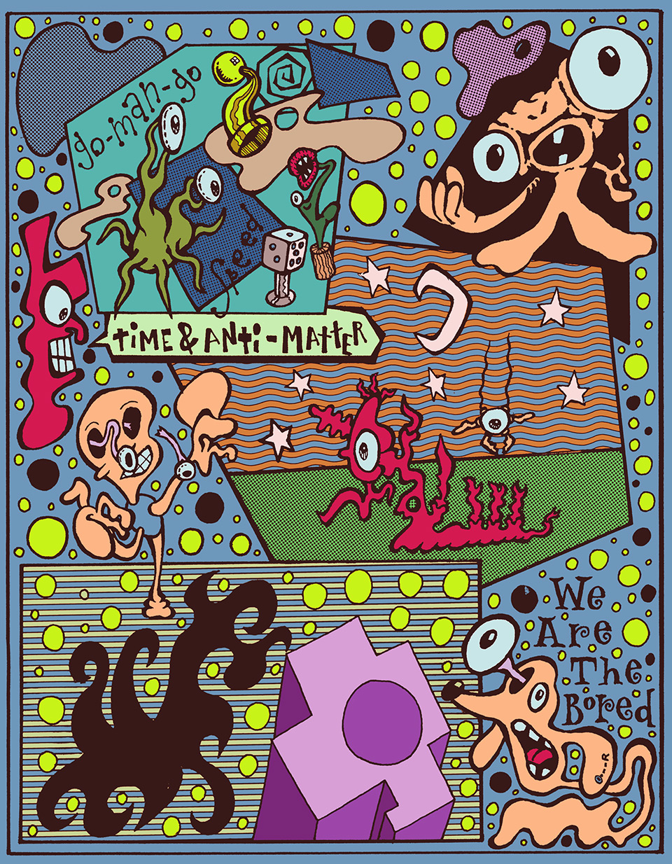 a psychedelic Illustration about time and anti-matter. it is chock full of eyeballs and tentacles.